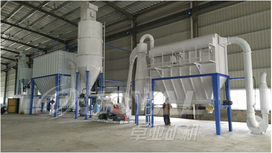 超細(xì)微粉磨機(jī)主機(jī)工作時(shí)是磨輥在離心力作用下緊緊地滾壓在磨環(huán)上,由鏟刀鏟起物料送到磨輥和磨環(huán)中間,物料在碾壓力的作用下粉磨成粉,然后在風(fēng)機(jī)的作用下把成粉的物料吹起來(lái)經(jīng)過(guò)分析機(jī),達(dá)到細(xì)度要求的物料通過(guò)分析機(jī),達(dá)不到要求的重回磨腔繼續(xù)研磨,通過(guò)分析機(jī)的物料進(jìn)旋風(fēng)分離器分離收集。排風(fēng)采用工業(yè)濾布隔離排風(fēng)一次成粉。